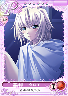 嘉神川クロエ(かがみがわ くろえ) 声 後藤邑子 青峯学院大学経済学部1年生。澄空学園の前生徒会長。 周囲の人に対する思い遣りが強く、その時は行動力、判断力に優れる。 7月2日生まれ・19歳。 ちなみに嘉神川一家のキャストは全員ぷろだくしょんバオバブ所属(当時)である。 稲穂鈴嘉神川クロエの新規録り下ろしボイスを使用したdmmスクラッチだけの超レアアイテム! 彼女に起こしてもらって、素敵な一日を送りましょう♪ a1嘉神川クロエ b2タペストリー 全2種類 当せん 確率 5 100 あの時恋した相手と今も一緒に生活しましょう! b1白河ほたる b2陵いのり ミニ色紙Microsoft,Xbox,Xbox 360,XboxLIVE,Xbox関連ロゴは、米国Microsoft Corporationおよび/またはその関連会社の商標です。 当サイトに掲載されている 画像・文章・楽曲・音声 などは、著作権その他の権利が存在します。